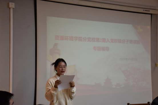 会上,入党积极分子A2121班曹嘉玮同学和发展对象A2031班程珊同学分别做了表态发言。表达了矢志不渝跟党走,争当先锋模范,争取早日成为一名真正的、光荣的中国共产党党员的愿望和决心。
