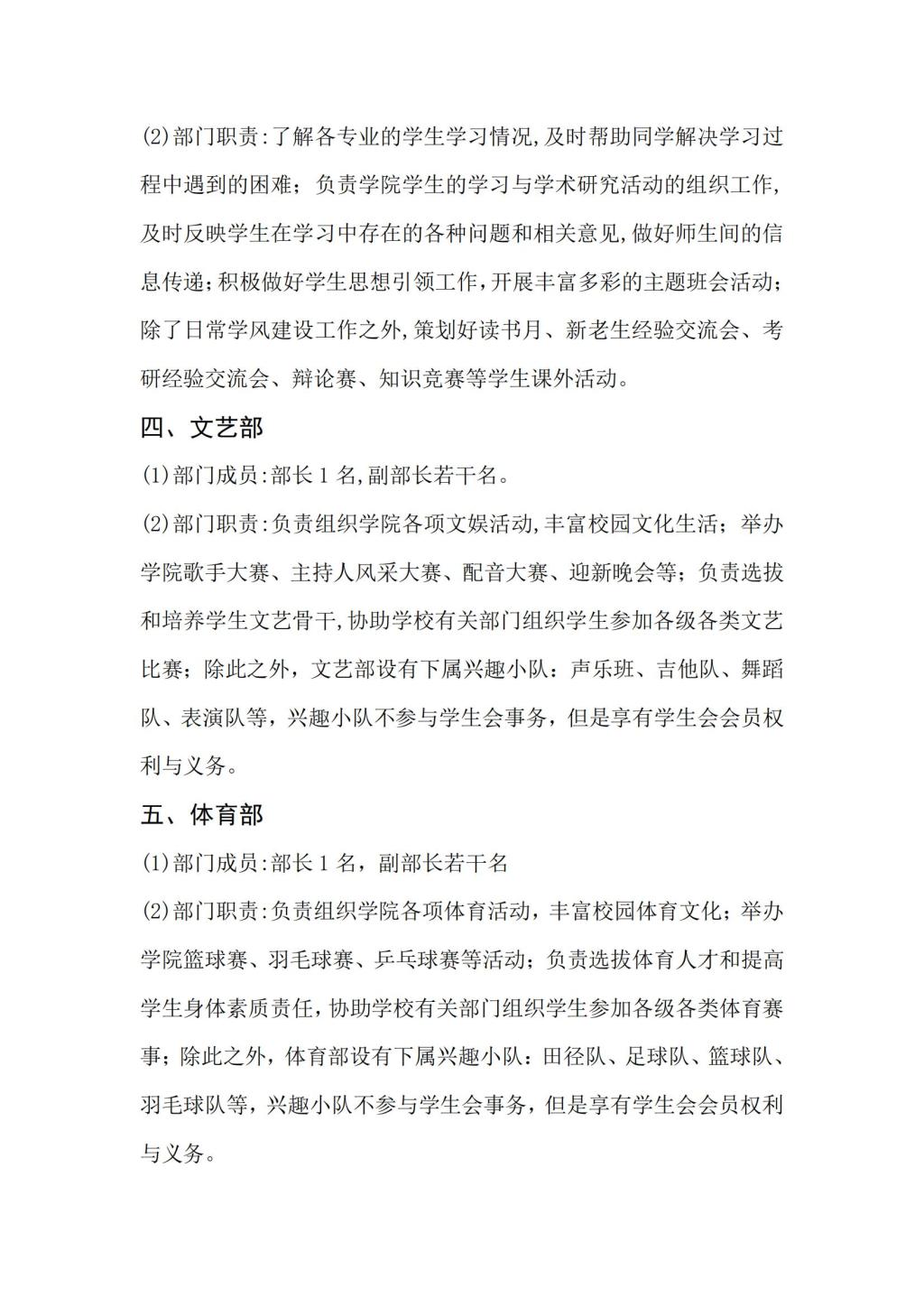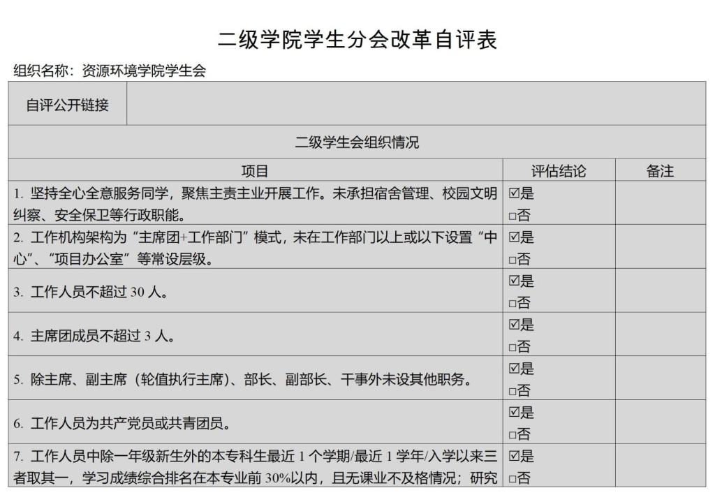 学生会实行自我管理、自我服务、自我教育、自我监督,是学院与学生联系的桥梁与纽带,接受广大师生监督。改革后的学生会主席团有3人,分会总共30人且共青团员覆盖率为100%,成绩考核综测均达标,部门精简后学生会由办公室、权益与服务部、宣传部、学习部、文艺部、体育部六个部门组成。现将改革情况公示如下: