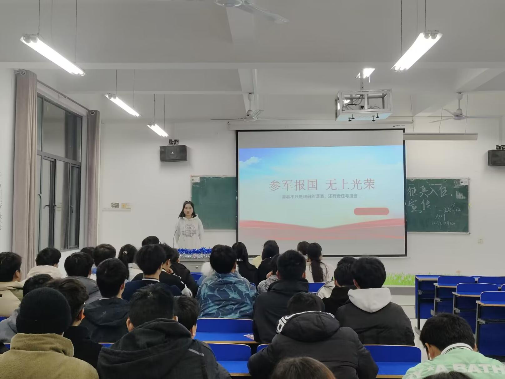 此次班会前各班班干精心准备了ppt和视频,用交叉讲解的形式帮助同学们更深入地了解应征入伍政策及军旅生活、征兵报名工作的具体方式、要求等,鼓励怀揣军旅梦的同学们勇敢地走进军营,实现自己的梦想,进一步激发同学们从军报国、投身国防的热情和决心。