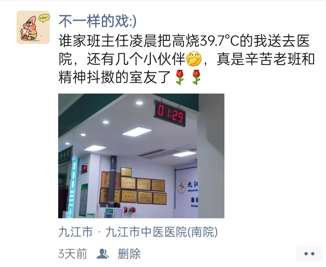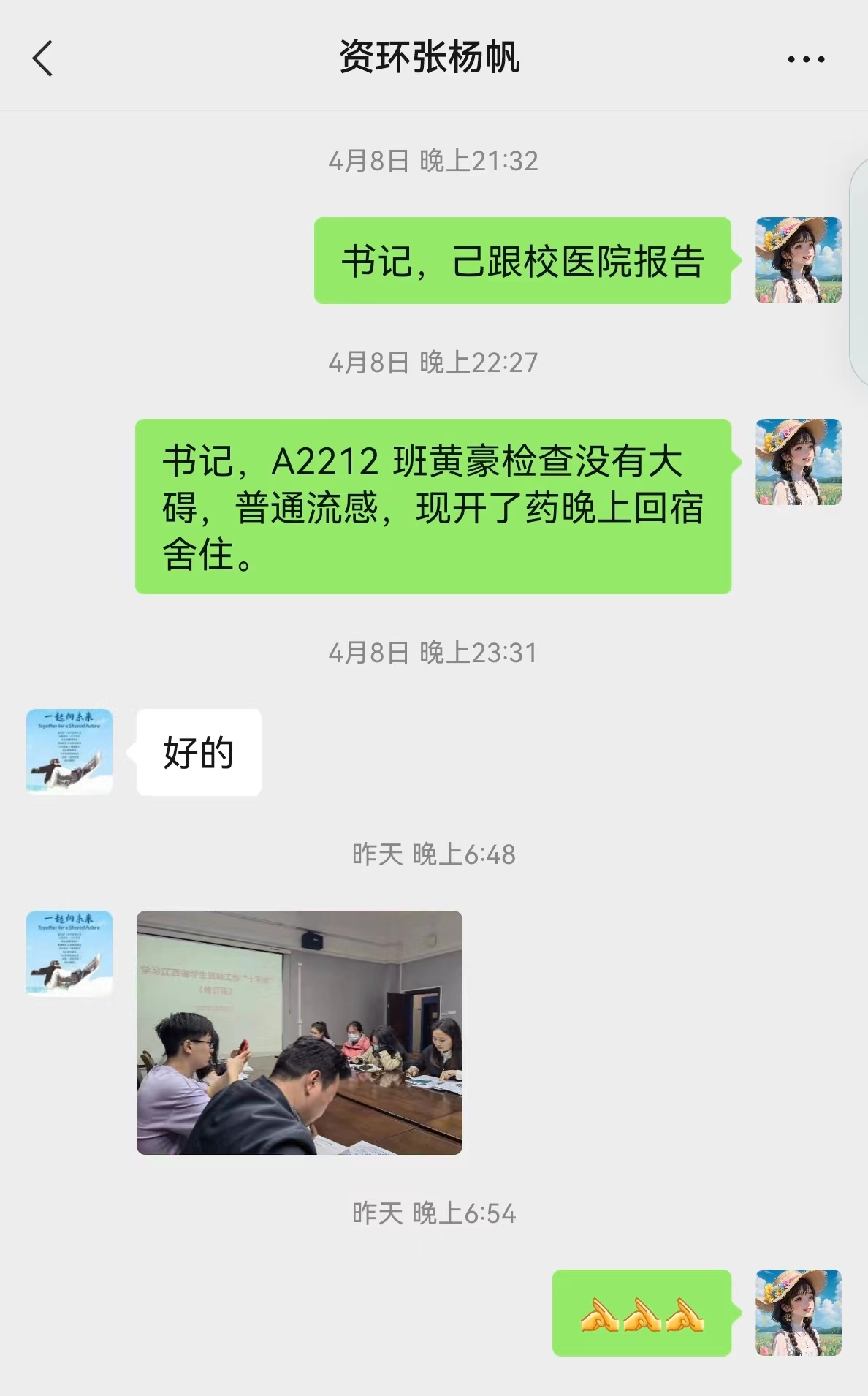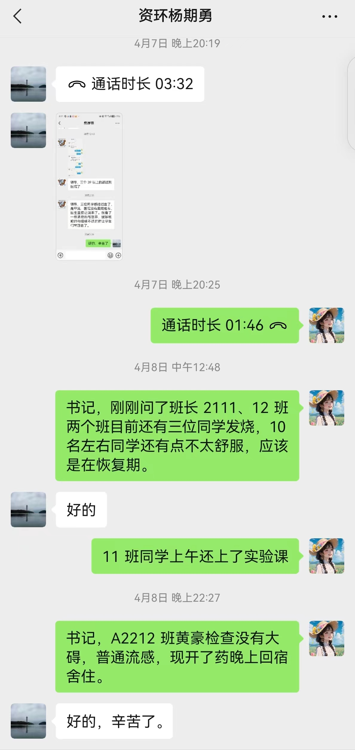 4月6日傍晚,Ky开元集团A2111、A2112、A2212班班主任熊厚锋、黄亮、李浩然三位班主任接到班干的电话报告发现班级多名同学有感冒发烧不舒服的症状,立即赶到宿舍看望学生,带学生就医,直至凌晨。