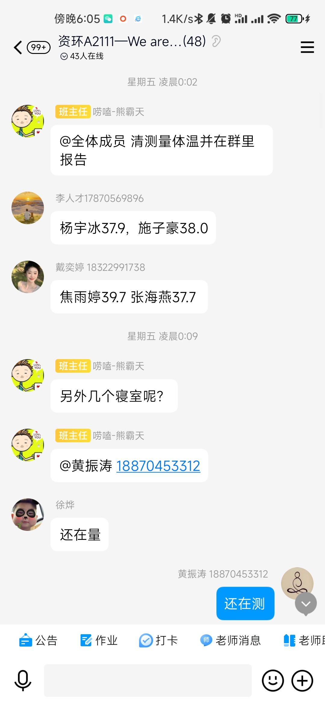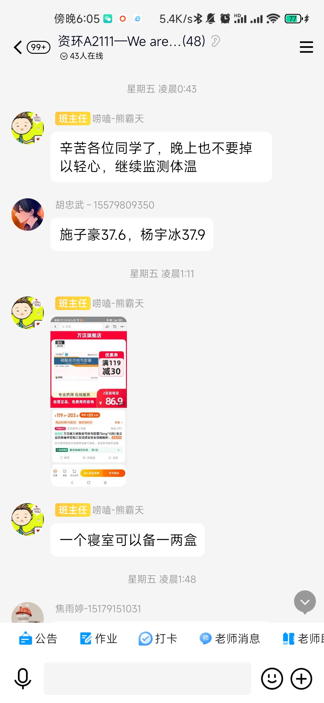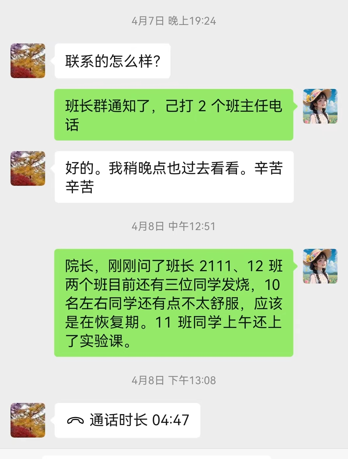 4月6日傍晚,Ky开元集团A2111、A2112、A2212班班主任熊厚锋、黄亮、李浩然三位班主任接到班干的电话报告发现班级多名同学有感冒发烧不舒服的症状,立即赶到宿舍看望学生,带学生就医,直至凌晨。