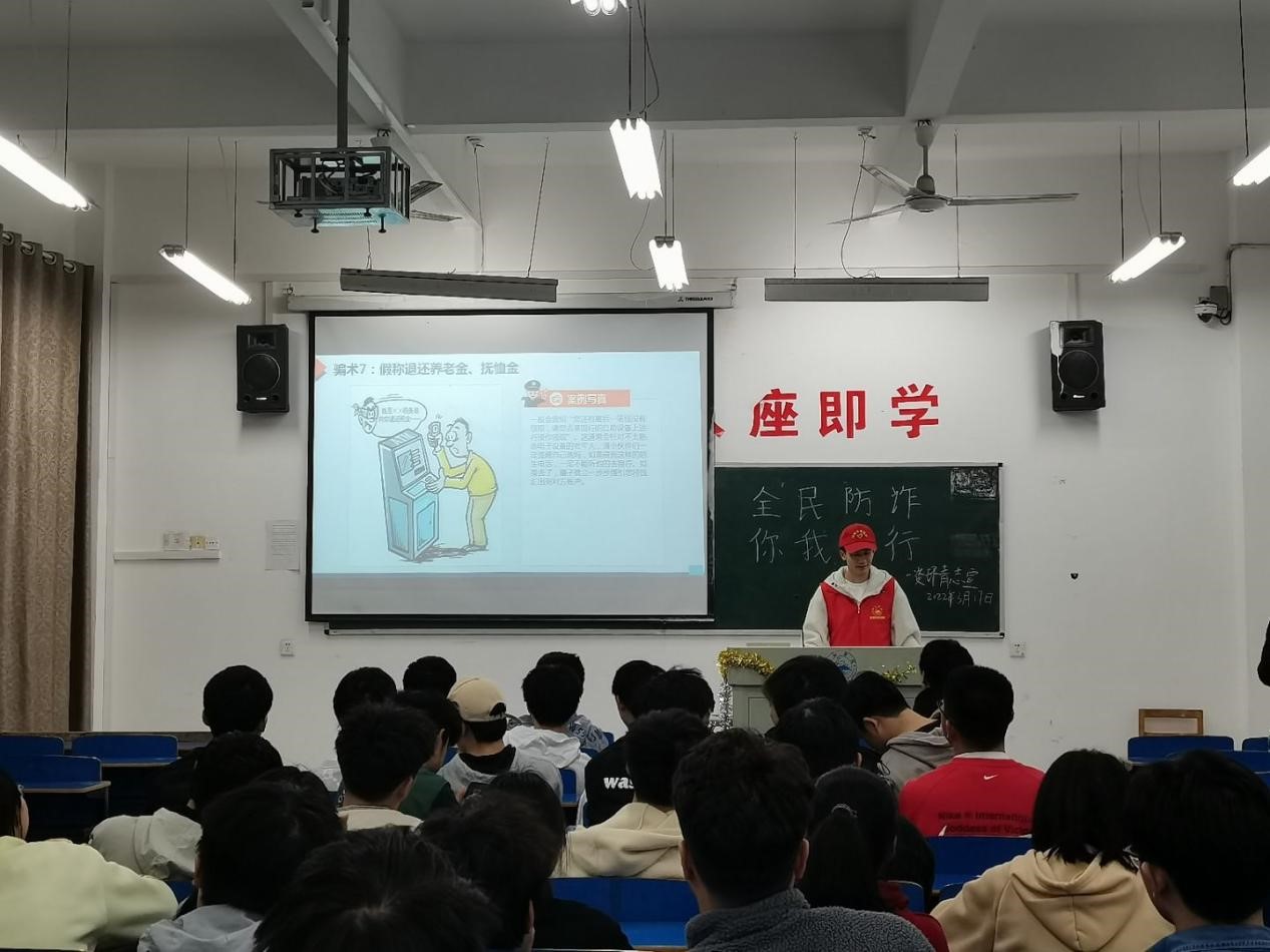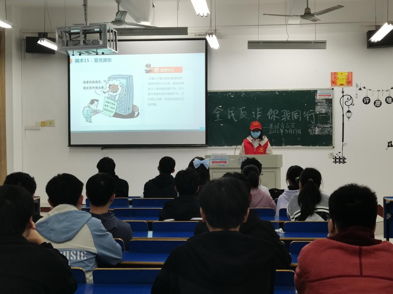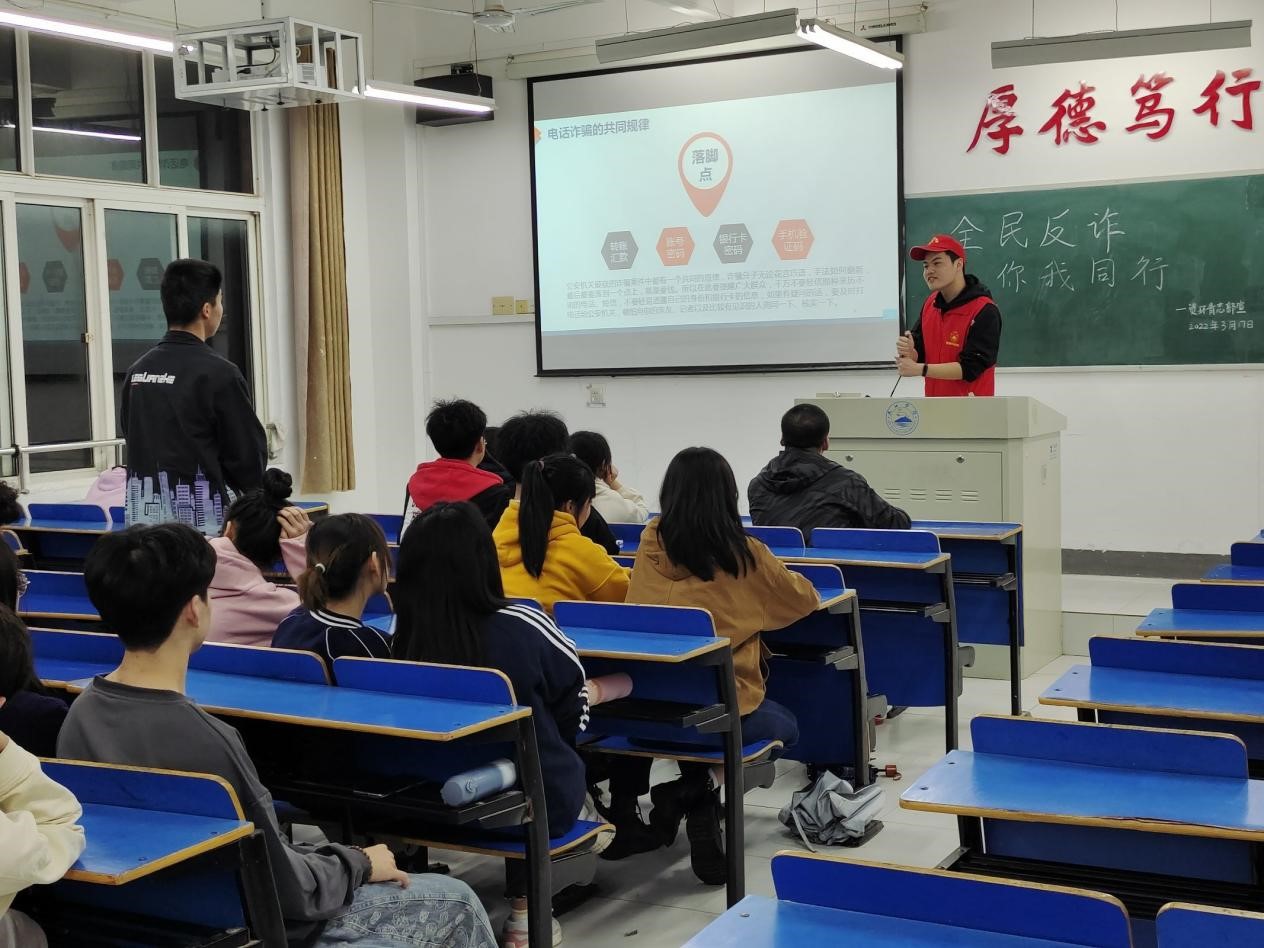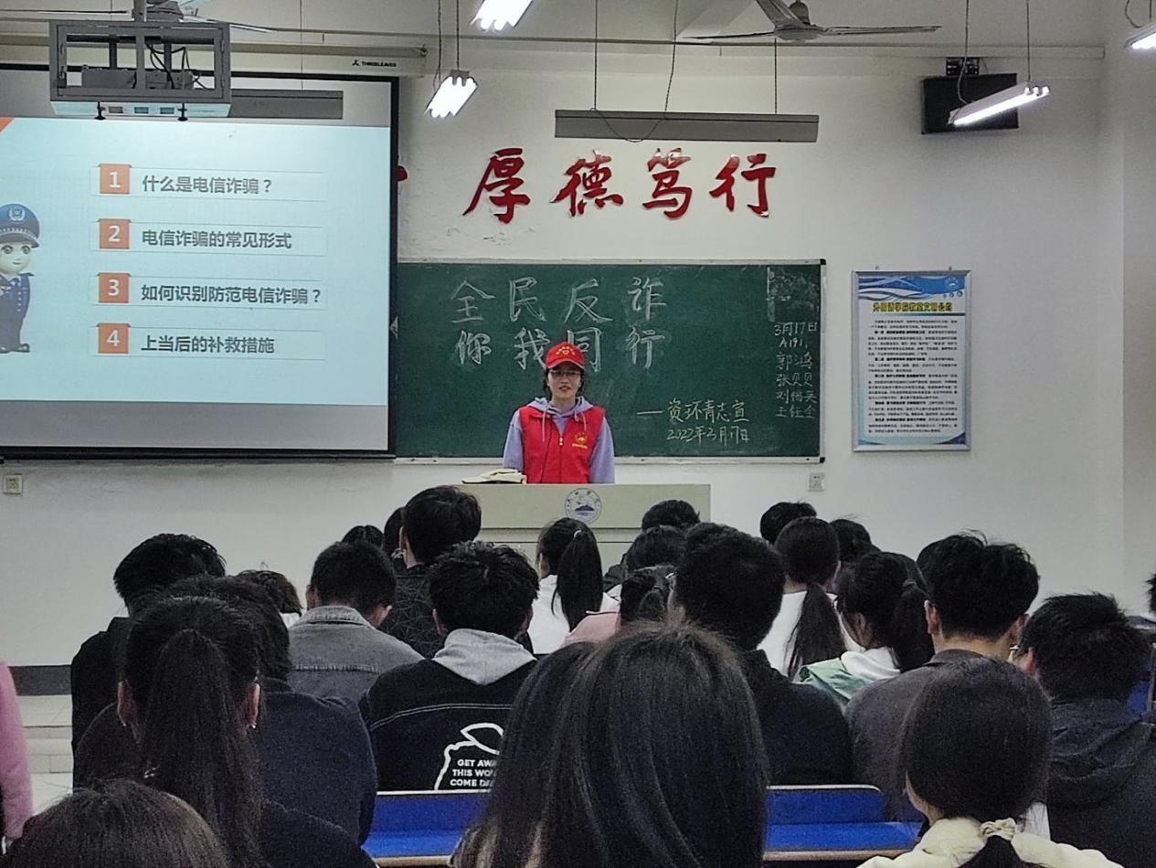 为提高同学们对电信诈骗手法的识别和防范能力,进一步加大校园防诈骗宣传力度、普及反诈知识、增强防范意识、营造平安和谐的校园环境,2022年3月17日,Ky开元集团组织青年志愿者服务队开展以“防范诈骗,人人参与”为主题的防范诈骗宣传活动。此次活动由青年志愿者服务队成员组织宣讲,全体资源环境学生参与,活动顺利举行。