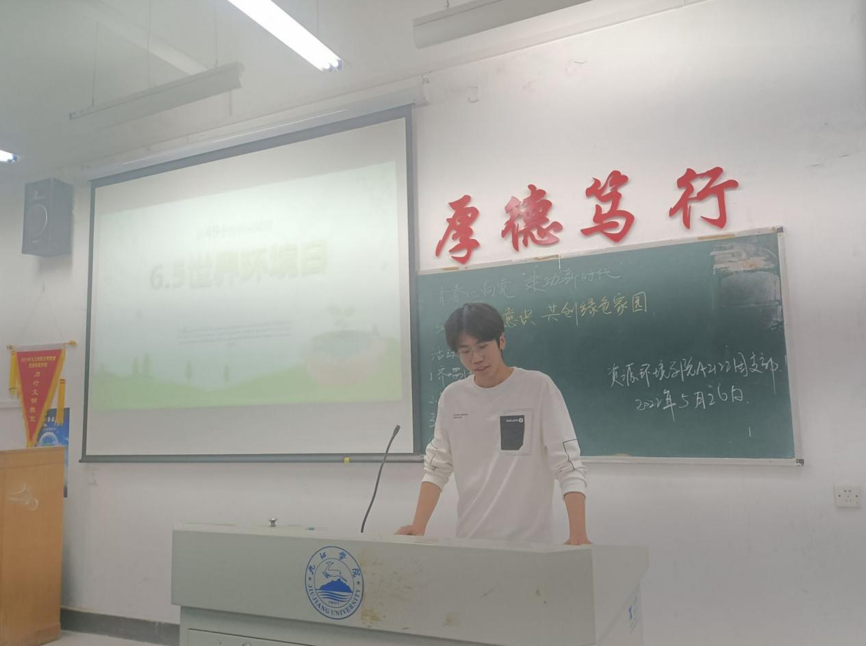 在热烈的掌声过后,各主讲人从地球现阶段存在的环境问题开始引入,期间讲述了许多生活中肉眼可见的环境问题和改善方式以达到宣传环保理念的目的,发挥环境在育人环节的重要作用。同时响应创建学院“两山”思政品牌,通过系统且细致的讲述将习近平生态文明思想融入到同学们的思想中去,引领同学在爱党爱国爱社会主义的同时爱清洁美丽的生活环境。此后,结合相关视频加深同学们的印象。视频结束,同学们轮番起立表达自己观后的思考与体会。晚上8时,活动在一片掌声中顺利落下帷幕。