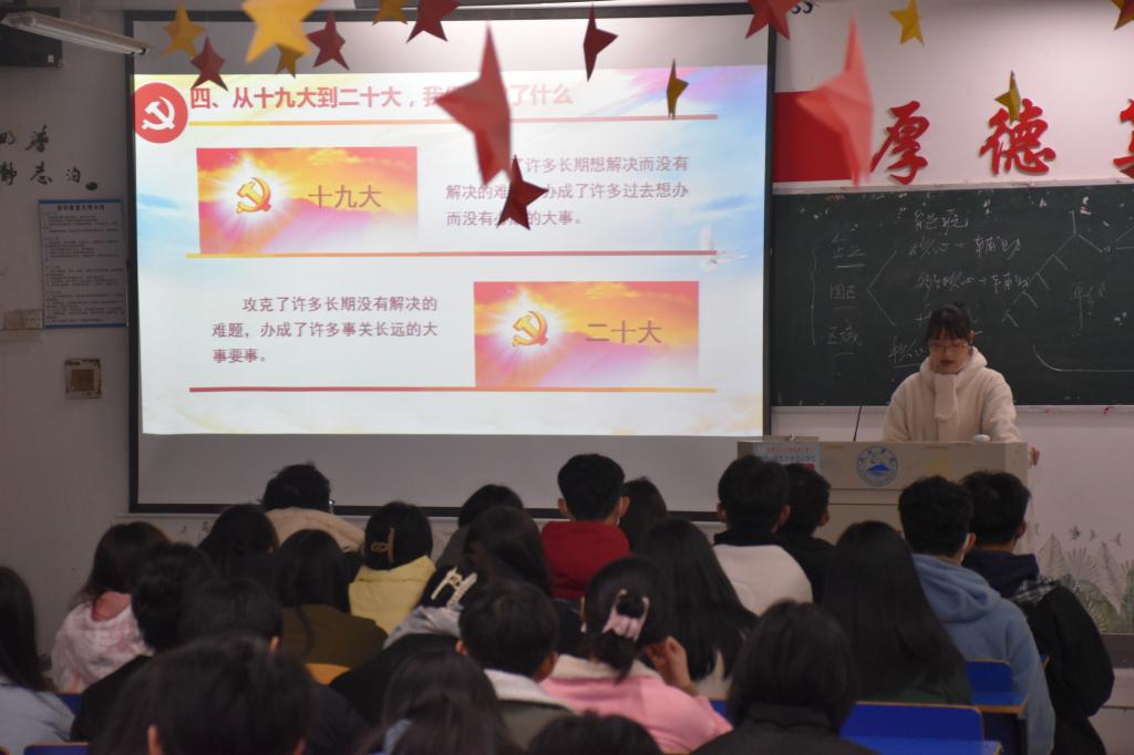 为深入学习贯彻习近平新时代中国特色社会主义思想,认真贯彻落实《中共中央关于认真学习宣传贯彻党的二十大精神的决定》,Ky开元集团于12月6日晚在香远楼405教室举行“永远跟党走,奋进新征程”党的二十大学生宣讲活动,此次活动由Ky开元集团宣讲团杨斐斐同学宣讲。