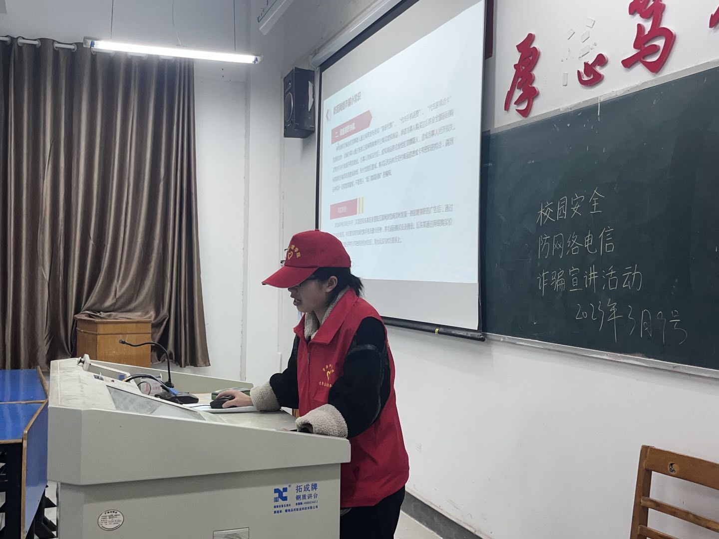 宣讲过程中,志愿者结合丰富多图的PPt和视频的方式在各班级进行防网络电信诈骗知识的宣传和普及,详细揭露了电信网络诈骗的步骤和伎俩,并着重开学以来“冒充QQ好友诈骗”,“网络兼职”等不少学生发生过的诈骗案例进行分析讲解。