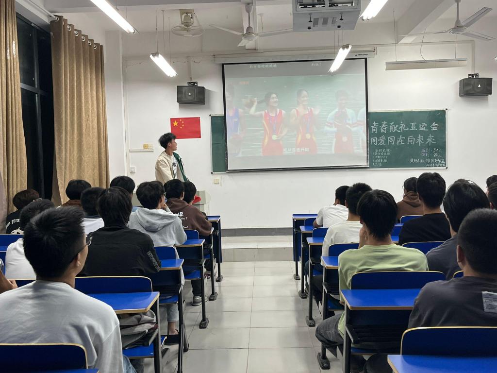 本次团日主题活动在同学们的朗朗团歌声中正式拉开序幕。各团支书围绕“品运动之韵,绘体育强国之梦”的主题通过PPT讲解或激情演讲的方式让同学们了解亚运会的起源和发展历程,同时穿插了亚运健儿的精彩集锦,让同学们切身体会到亚运风采。最后在亚运会宣传曲《亚洲雄风》中结束了本次活动。