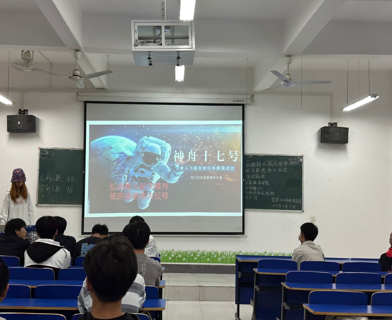 此次活动中,各团支部通过PPT的讲解讲述了中国航天日的由来和意义,以及中国航天事业的发展历程。同时以视频的形式展示了我国航天技术的发展,变迁和突破以及取得的重要成果。各团支部组织团员和青年们观看了神州十七号顺利升空的直播视频,介绍了本次航空工作的相关航天人员以及此次发射的意义,并于现场随机提问航天航空小知识。团日活动的最后,同学们对此次主题团日的活动内容进行交流和总结。