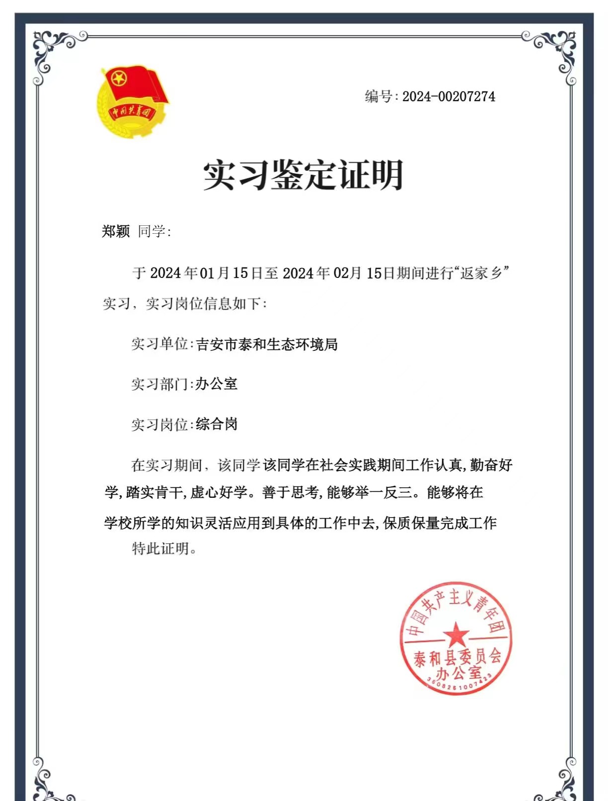 为更好地助力青少年健康快乐成长,寒假期间,团红谷滩区委、九龙湖街道团工委、安丰花园社区团支部组织“青英归巢“返乡大学生志愿者开展”缤纷冬日,快乐成长”寒假小课堂活动。开元官网志愿者惠琬欣积极响应号召。郑颖同学于吉安市泰和生态环境局实习。在实践中,通过切身体会,加深了对环境监测保护的工作和职责的认知,并对其在国家机关中的重要作用有了深刻理解。通过实习,郑颖同学增长了自己的见识,提升了自己的才能,培养了自己的韧性,受益匪浅。