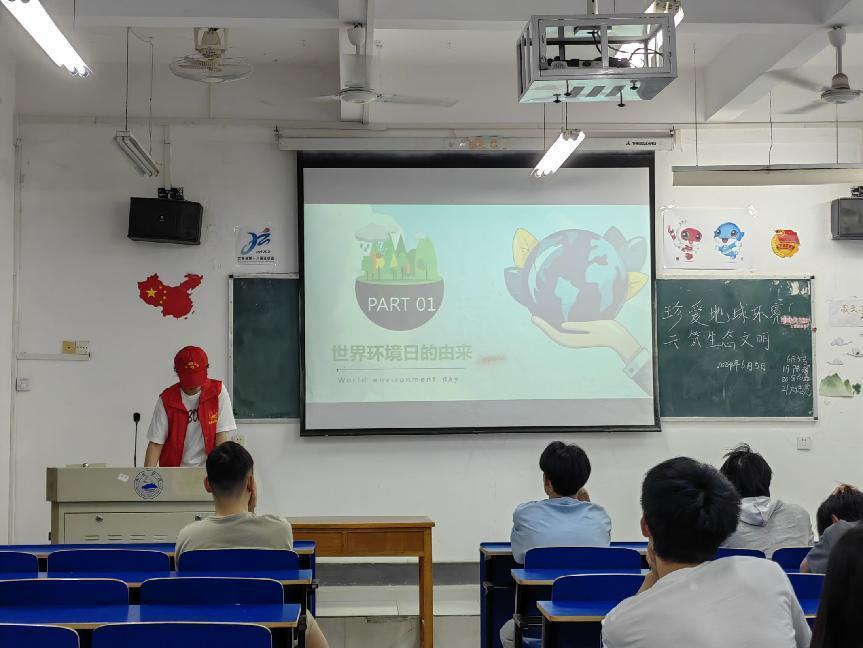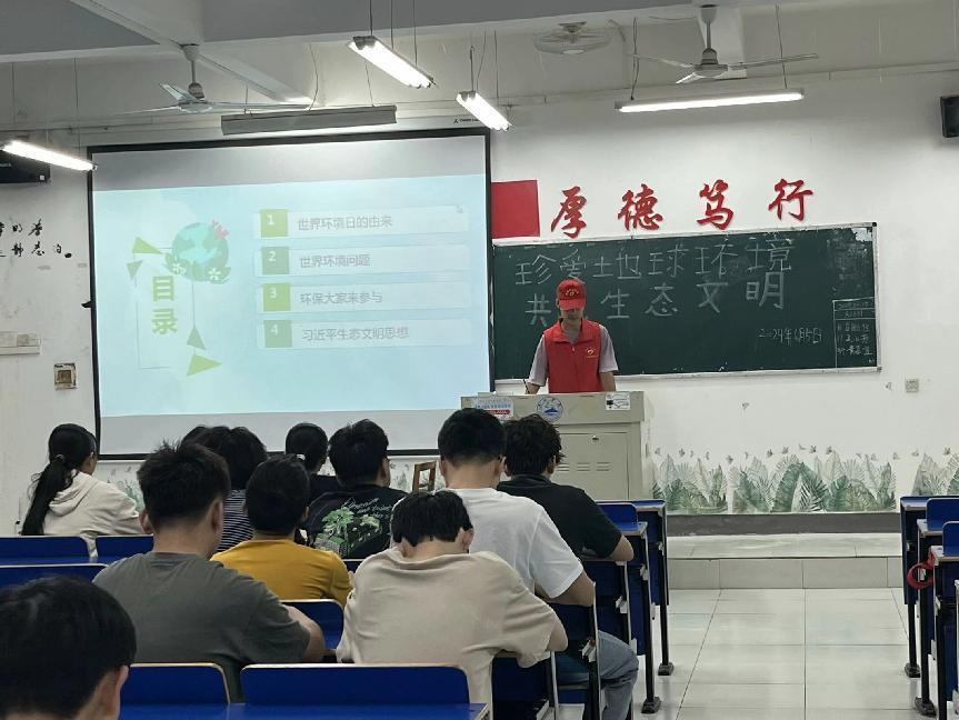 被分为三个小组的志愿者们有序到各班宣讲关于六五世界环境日的相关知识。通过使用PPT与播放习近平生态文明思想的相关视频,这些生动有趣的宣讲方式,让同学们可以将六五世界环境日的重要知识点牢记于心,并提高对环境的保护意识和对生态文明的理解。