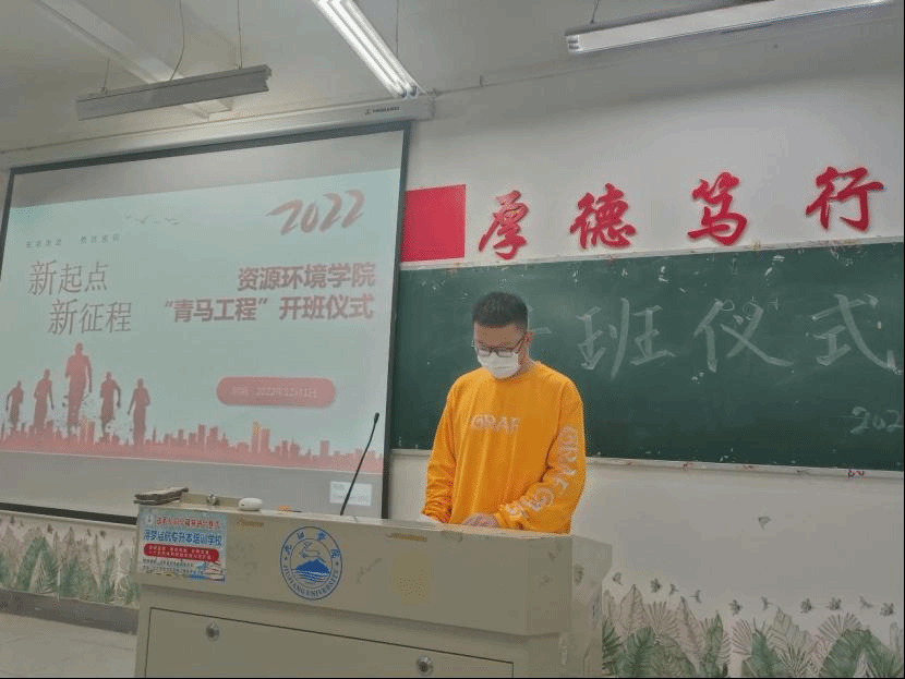 仪式上,资环学院组织部部长曹嘉玮对本届青马培训的整体情况进行了介绍,根据《关于深入实施青年马克思主义者培养工程的意见》文件精神,本次青马培训将从理论学习、红色教育、劳动实践、社会实践等方面进行培训,旨在促进学生的全面发展,为党培养信仰坚定、能力突出、素质优良、作风过硬的青年政治骨干。