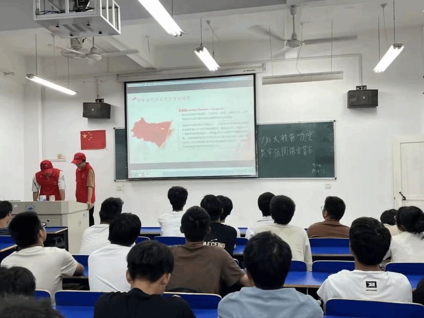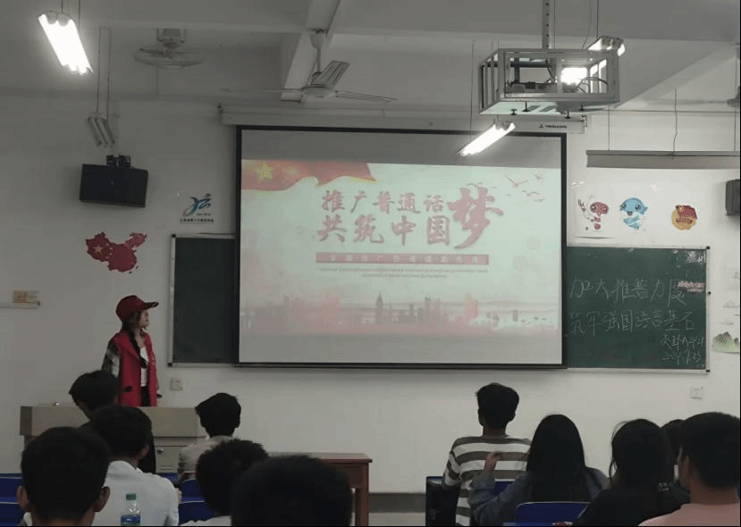 本次宣讲活动得到了广大学生的积极反应,志愿者们组成小队,走进各班教室进行宣讲。志愿者通过图文并茂的PPT、举例分析等形式综合地介绍了推广普通话的必要性,使同学们了解到推广普通话有利于维护国家主权和民族尊严,有利于国家统一和民族团结,有利于社会主义物质文明建设和精神文明建设。