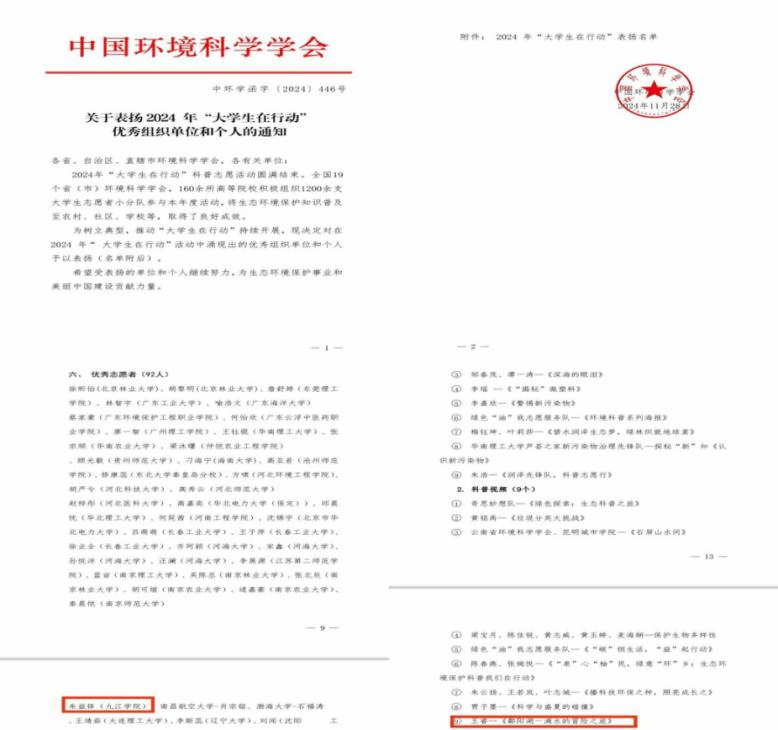 近日,中国环境科学学会发布了《关于表扬2024年“大学生在行动”优秀组织单位和个人的通知》,Ky开元集团朱益锋获“优秀志愿者”,Ky开元集团王睿—《鄱阳湖一滴水的冒险之旅》荣获“优秀科普作品”。此次荣获中国环境科学学会2024年“大学生在行动”的表彰,不仅是对学院工作的肯定,更是对学院未来工作的鞭策和激励。Ky开元集团将继续开展“大学生在行动”系列活动,进一步提高公众的环保意识和参与度,“大学生在行动”系列活动将取得更加显著的成效,为美丽中国生态江西建设贡献更多力量。