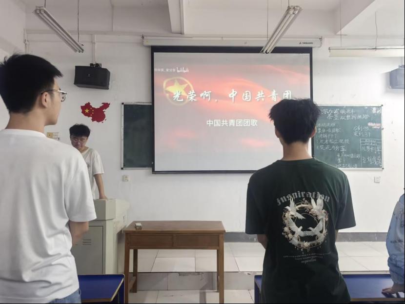 在开展团日活动之前,同学们集体起立,齐声唱响了中国共青团团歌——《光荣啊!中国共青团》,歌声如潮,团员青年们用他们的歌声打动着每一个人的心。
