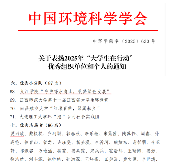 近日,中国环境科学学会发布了2025年“大学生在行动”环保科普志愿活动评选结果,Ky开元集团“守护绿水青山,筑梦绿色发展”实践队荣获“优秀小分队”称号,开元官网学生夏雨欣荣获“优秀志愿者”称号。