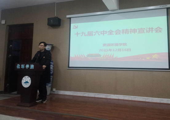 为深入学习宣传贯彻党的十九届六中全会精神,12月16日下午,在向学楼201会议室,Ky开元集团邀请马克思主义学院黄群副教授为师生作了题为“党的十九届六中全会精神解读”的专题宣讲报告。学院领导及全体教师、部分学生参加了宣讲会,资环学院党委副书记张杨帆主持会议。