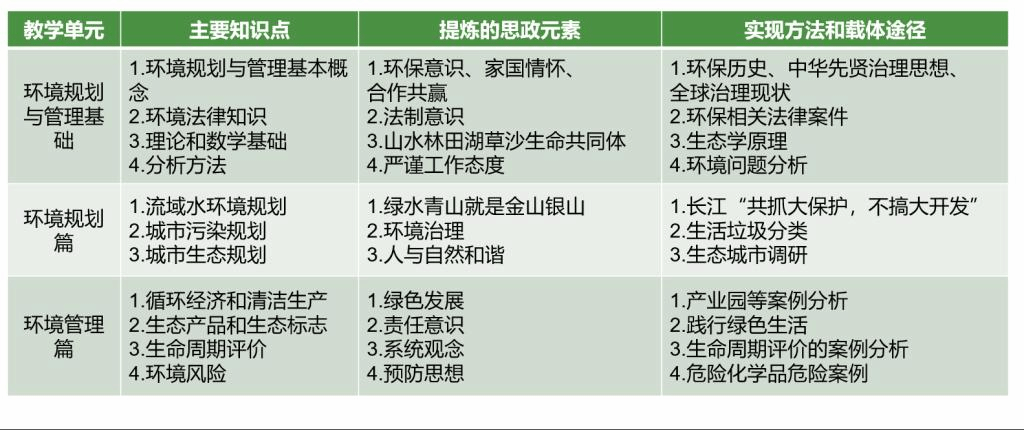 在对课程整体设计的基础之上,确定生态文明(绿色发展、人与自然和谐)、职业素养(工程伦理、系统思维)和爱国主义(科技报国、责任担当)的特色鲜明思政主题,并提炼生态文明地域特色资源,构建具有地域特色的生态文明教育资源库。同时创新融合方式,采用线上线上混合式教学方式,践行“学校-社会-企业”多元协同的生态文明实践育人模式,进行多元考核评价方式,形成可执行的课程思政教学方案,并持续优化完善。